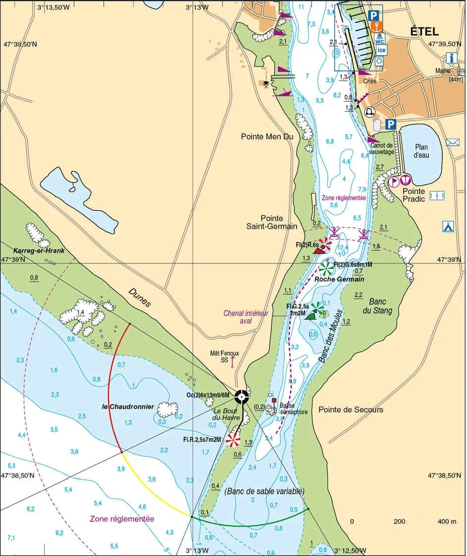 • Sémaphore Canal VHF 13 Tel : 02 97 55 35 59 (de PM -3H à +2H) - Une flêche indique les mvts à suivre, Mât Fenoux.