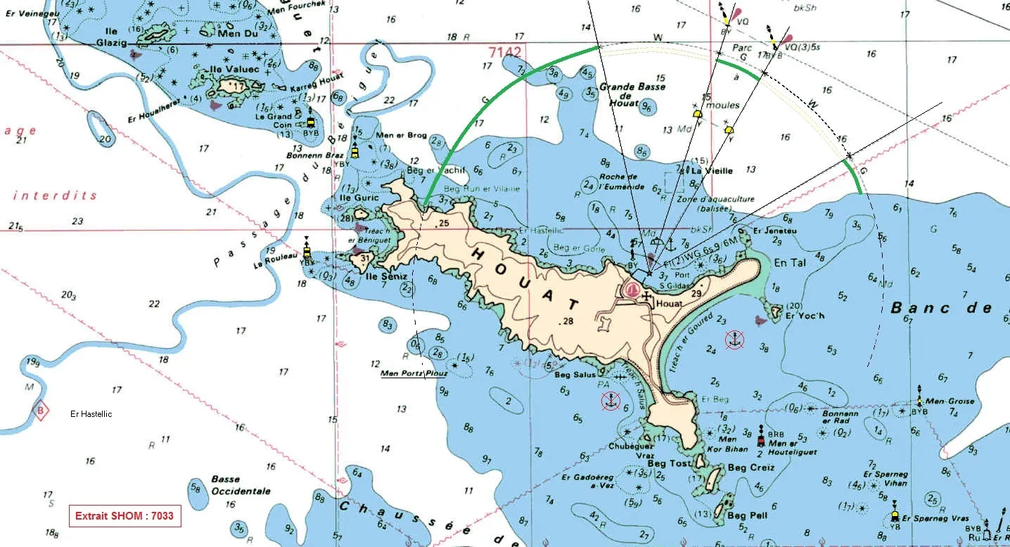 • Mouillage interdit sur les plages de Treac’h er Goured et Treac’h er Salus (Cf. carte hydro. n° 7033) : zones de câbles.