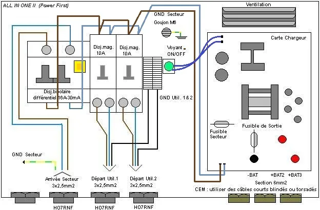 Trois batteries situées dans trois bacs étanches du compartiment moteur, accessibles par l'escalier escamotable de la cabine.