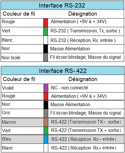 • Câblage :Deux fois 2 paires torsadées + Masse + Blindage si possible